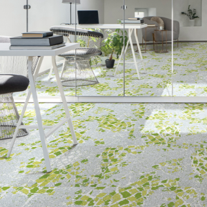 The carpet tile is produced on a 1/12th gauge machine, providing a finer, denser construction.